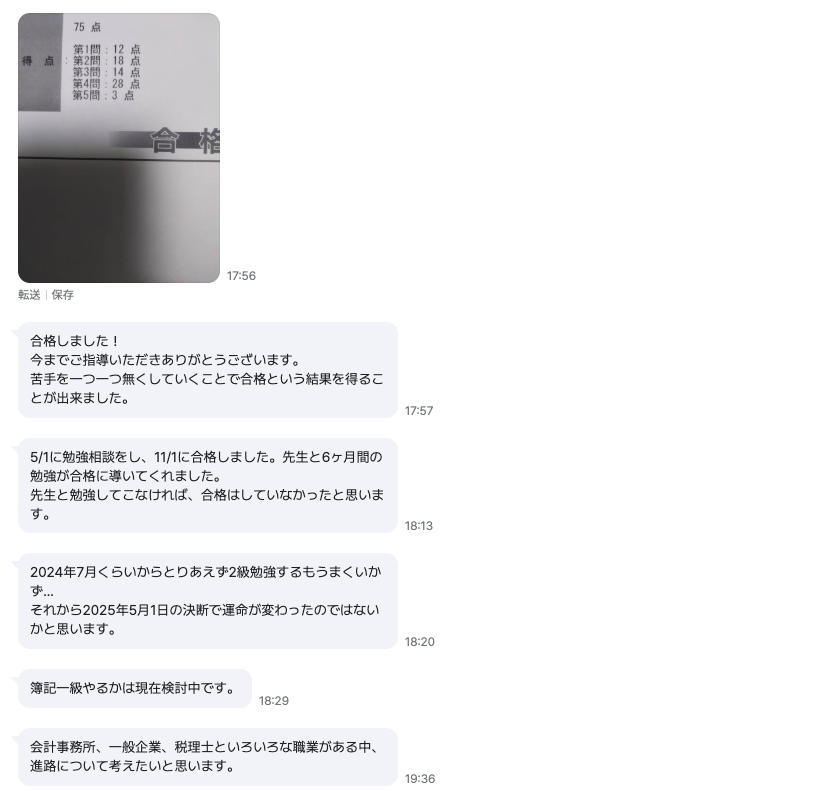 今回合格されたお客様は、簿記1級や会計事務所、税理士など、いろんなキャリアの選択肢が開けたので、今後の活躍も応援したいですね。